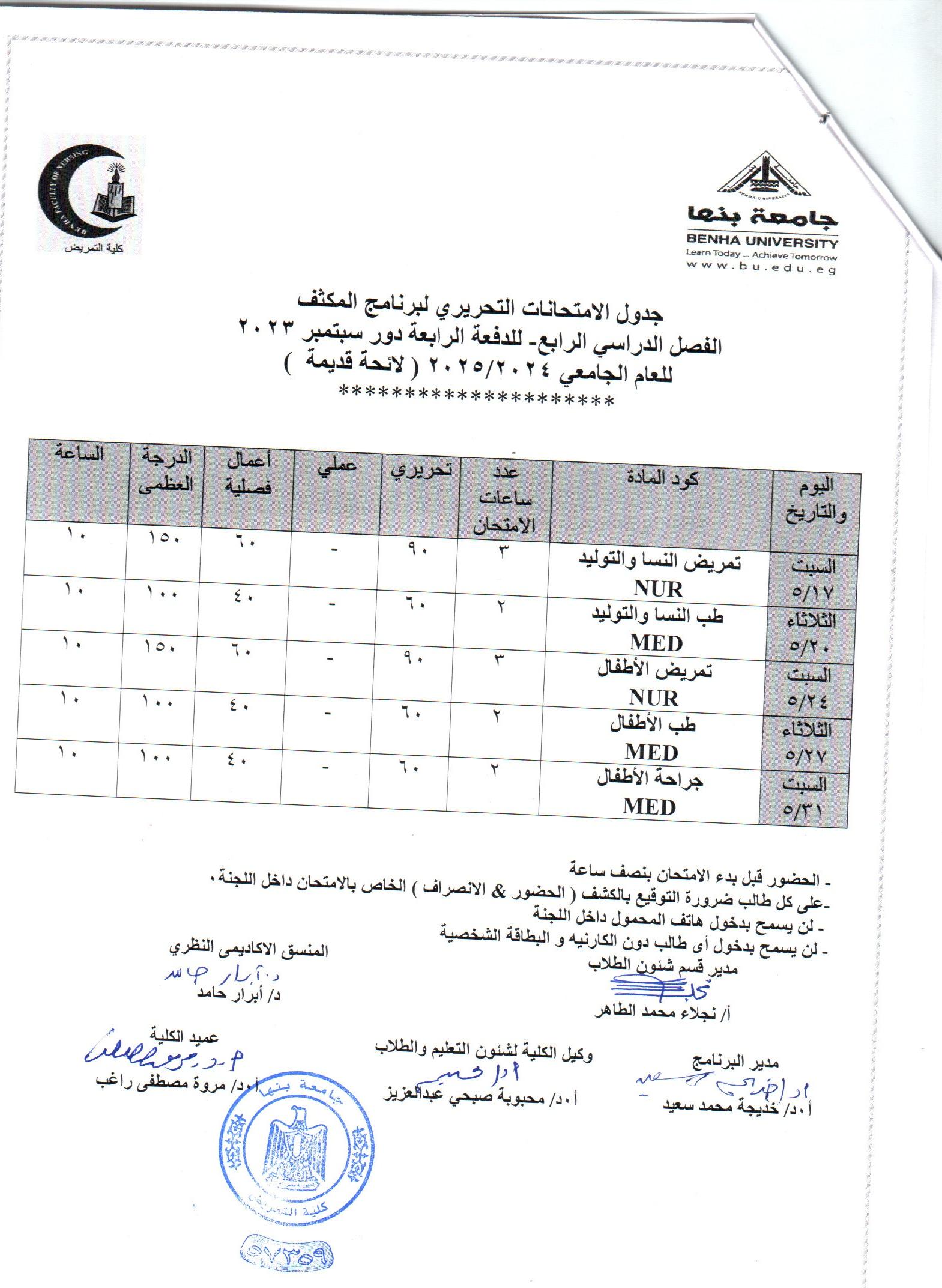 - جدول امتحانات طلاب المكثف الدفعة الرابعة دور سبتمبرالفصل الدراسى الرابع للعام الجامعى 2024-2025