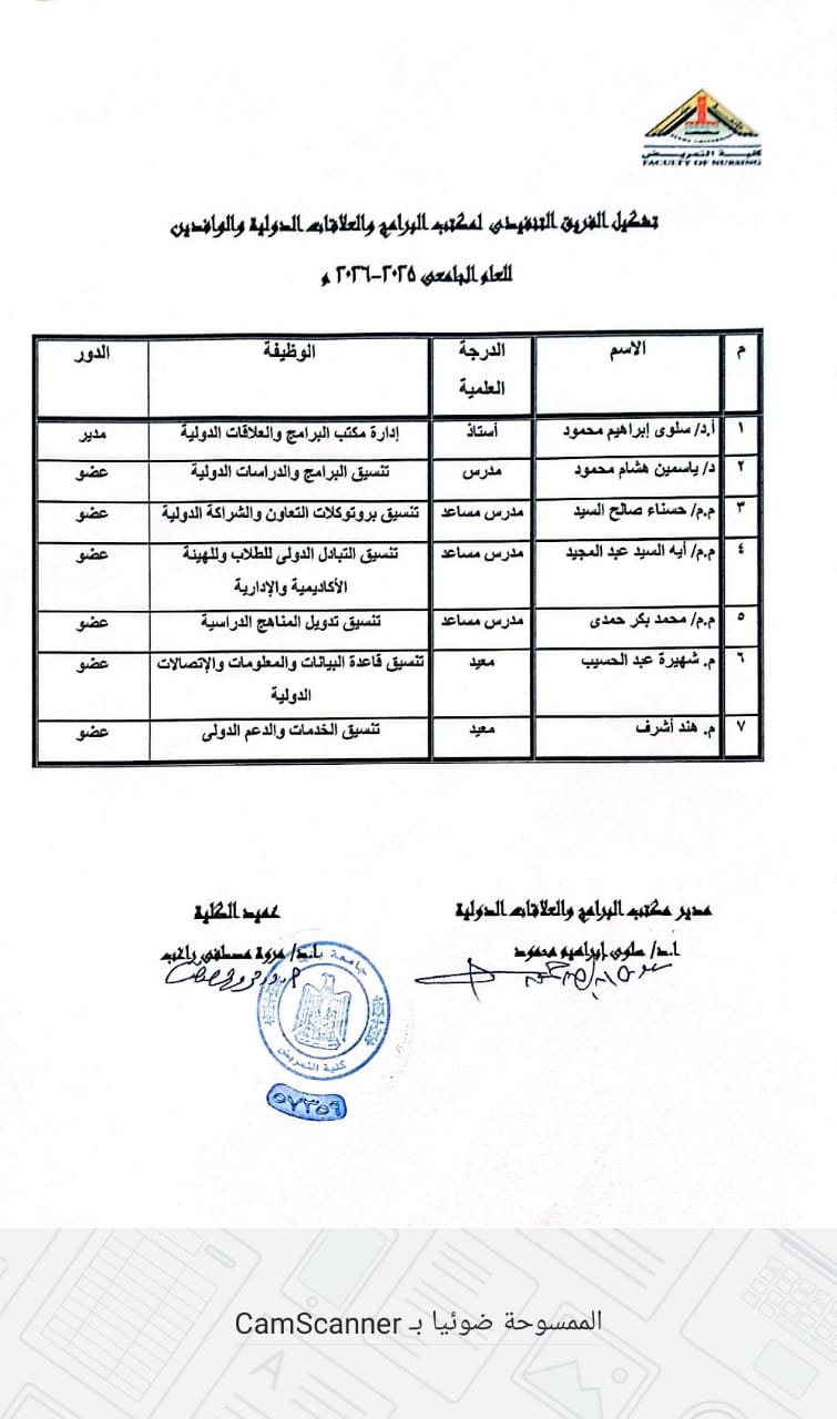 تشكيل الفريق التنفيذى لمكتب البرامج والعلاقات الدولية والوافدين للعام الجامعى 2025-2026