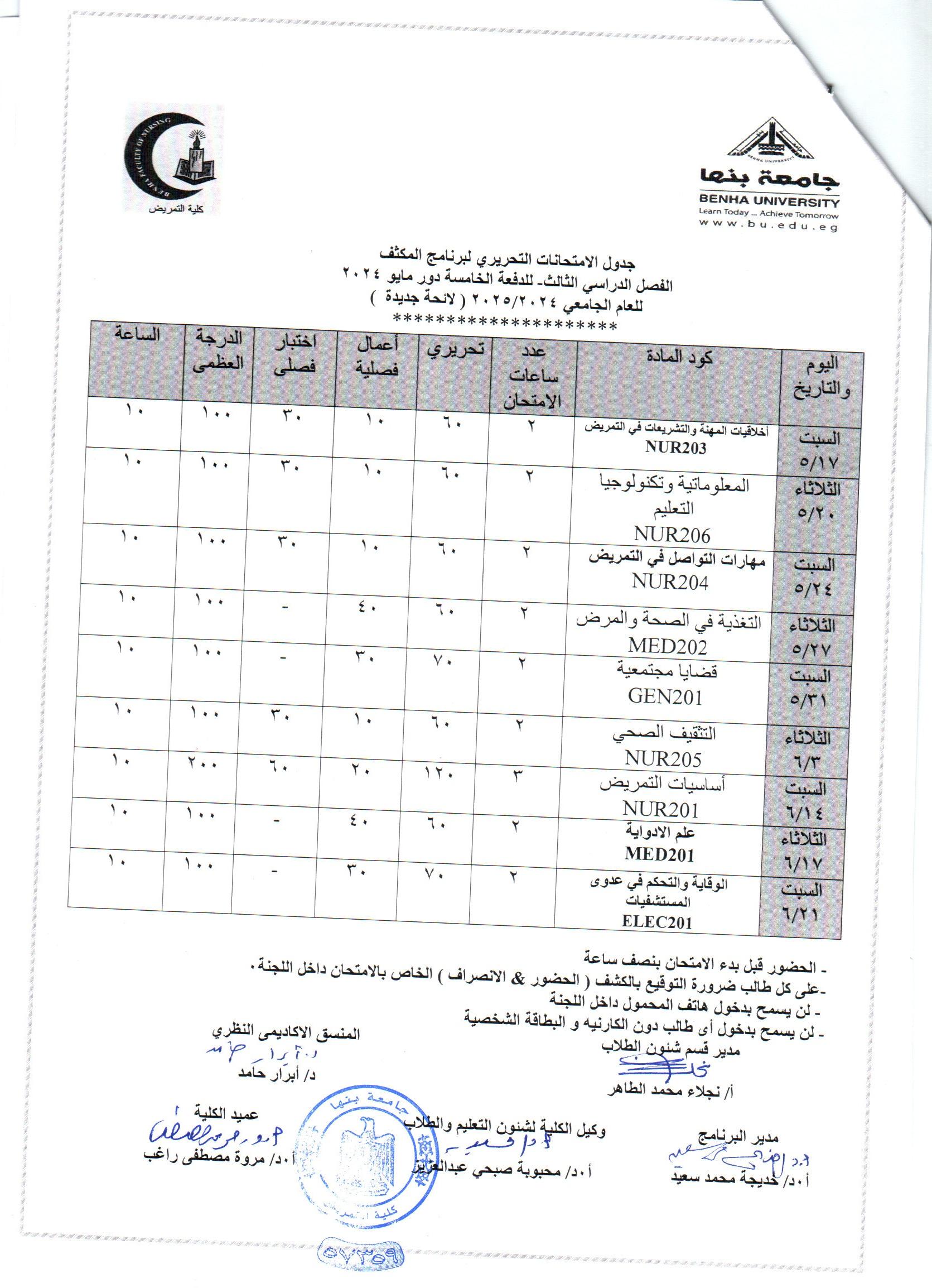 - جدول امتحانات طلاب المكثف الدفعة الخامسة دور مايوالفصل الدراسى الثالث للعام الجامعى 2024-2025