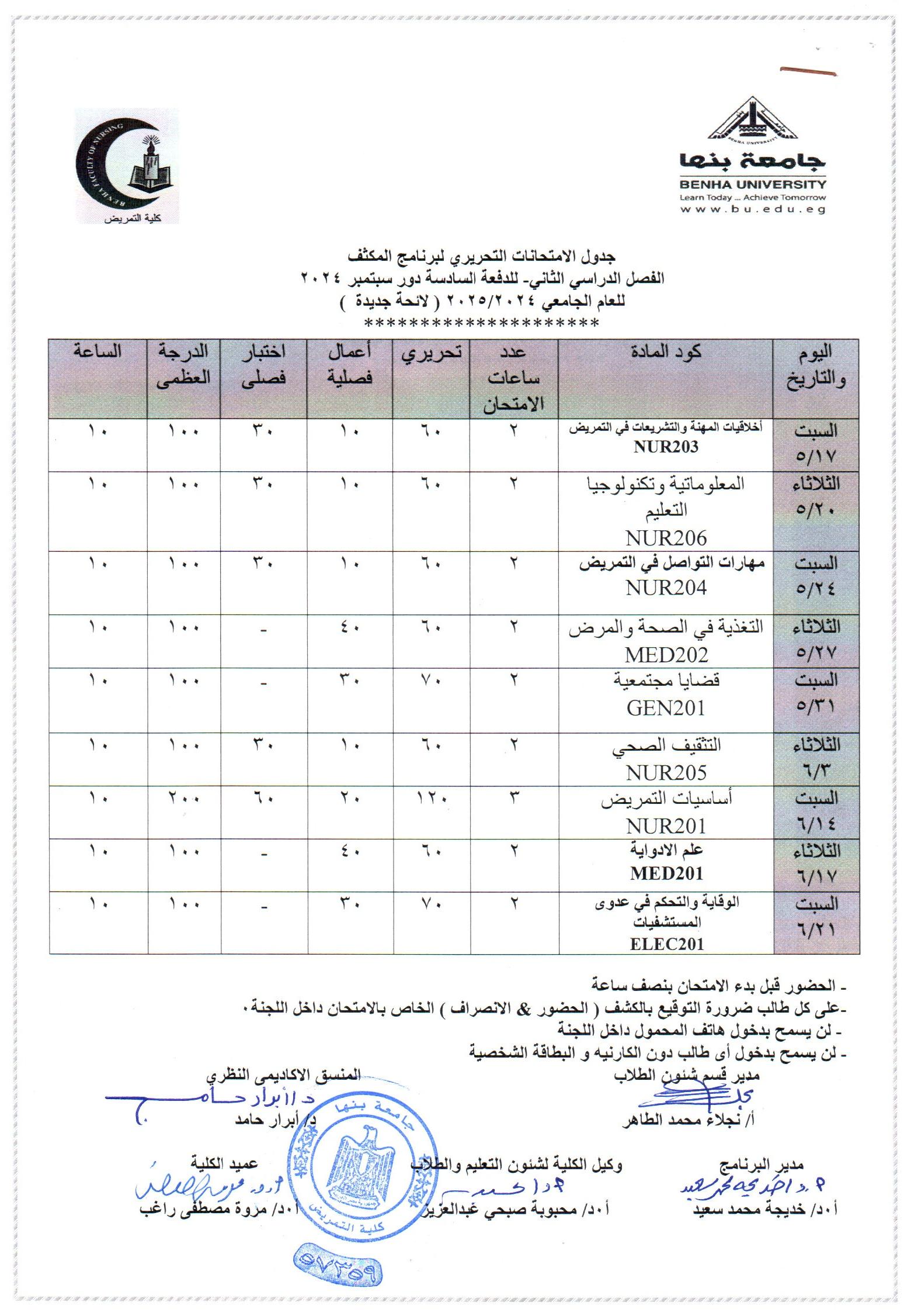 - جدول امتحانات طلاب المكثف الدفعة السادسة دور سبتمبرالفصل الدراسى الثانى للعام الجامعى 2024-2025