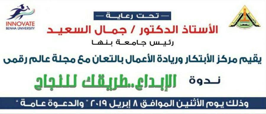 في إطار اهتمام وتوجهات رئيس الجمهورية لرؤساء الجامعات في منتدي التعليم العالي بالإهتمام بالنابغين والمبتكرين ينظم اليوم مركز الإبتكار وريادة الأعمال بجامعة بنها وبالتعاون مع جريدة عالم رقمي والتي تهدف إلى نشر الوعى الإبتكاري في مجال التكنولوجيا في كافة المجالات العلمية.