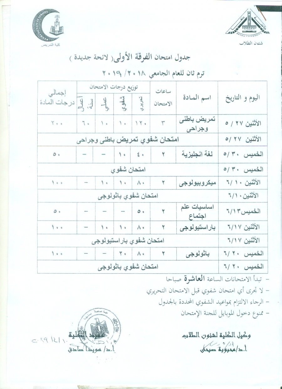 جدول امتحان الفرقة الاولى (لائحة جديدة ) ترم ثان للعام الجامعى 2018/2019