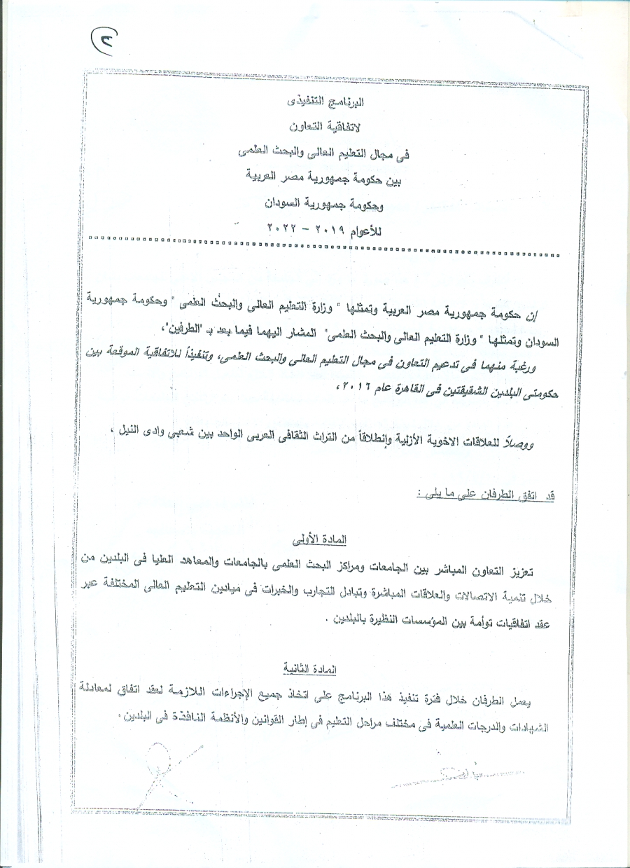 بنود اتفاقية التعاون في مجال التعليم العالي والبحث العلمي بين مصر والسودان للاعوام 2019/2022 موضح بالمرفق