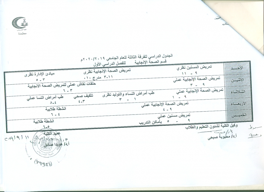 الجدول الدراسى للفرقة الثالثة ترم اول ( قسم الصحة الانجابية ) للعام الجامعى 2019/2020