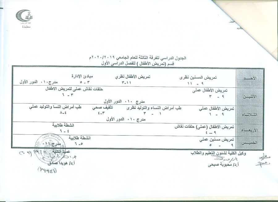 الجدول الدراسى للفرقة الثالثة ترم اول ( قسم تمريض الاطفال ) للعام الجامعى 2019/2020