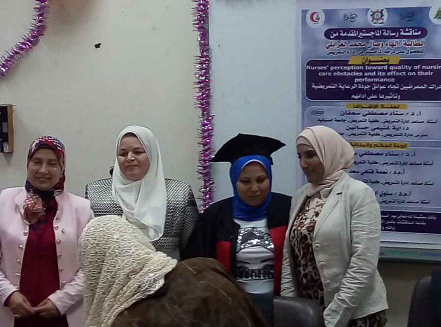 تمت مناقشة رسالة الماجستير المقدمه من الطالبه / إلهام وصال محمد بقسم ادارة الخدمات التمريضيه تحت عنوان " ادراك الممرضيين تجاه جودة الرعايه التمريضيه وتأثيرها على أدائهم وذلك تحت اشراف أ.م.د/ سناء مصطفى أستاذ مساعد ادارة التمريض جامعة المنوفيه , د/ أيه غنيمى حسانين مدرس ادارة التمريض جامعة بنها والممتحنيين أ.م.د/ نعمه فتحى سعد " ممتحن خارجى " أستاذ مساعد ادارة التمريض جامعة عين شمس , أ.م.د/ سلوى ابراهيم محمود " ممتحن داخلى " استاذ مساعد ادارة التمريض جامعة بنها , أ.م.د/ سناء مصطفى " عن المشرفيين " أستاذ مساعد ادارة التمريض جامعة المنوفيه وذلك يوم السبت الموافق 2/11/2019 .