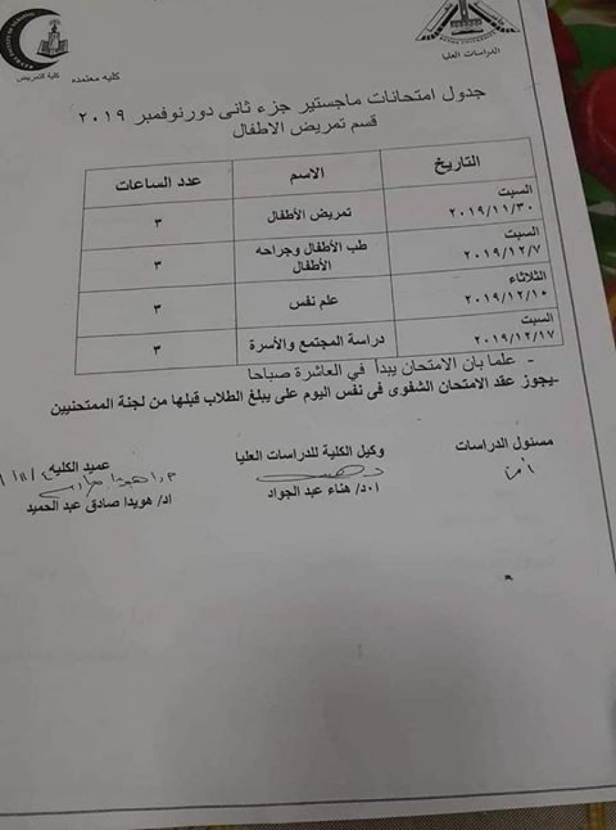 جدول امتحانات ماجستير جزء ثان قسم تمريض الاطفال