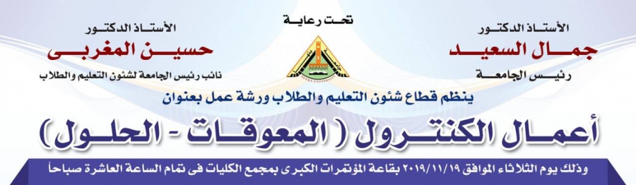 مشاركة وكيل الكليه لشئون التعليم والطلاب ا.د. محبوبه صبحى وروؤساء كنترولات كلية التمريض فى حضور ورشة عمل بعنوان اعمال الكنترولات بقاعة المؤتمرات الكبرى بمجمع الكليات وذلك يوم الثلاثاء الموافق 19/11/2019. تحت رعاية رئيس الجامعه أ .د. جمال السعيد ونائب رئيس الجامعه لشئون التعليم والطلاب أ .د. حسين المغربى