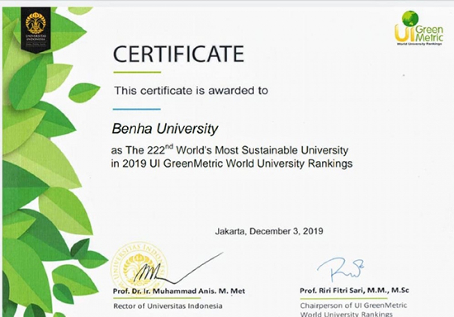 أعلن الدكتور جمال السعيد رئيس جامعة بنها انضمام الجامعة لقائمة أفضل 222 جامعة عالمية وفقا لتصنيف الجامعات الخضراء الصديقة للبيئة جرين متريك UI Green Metrics لعام ٢٠١٩.