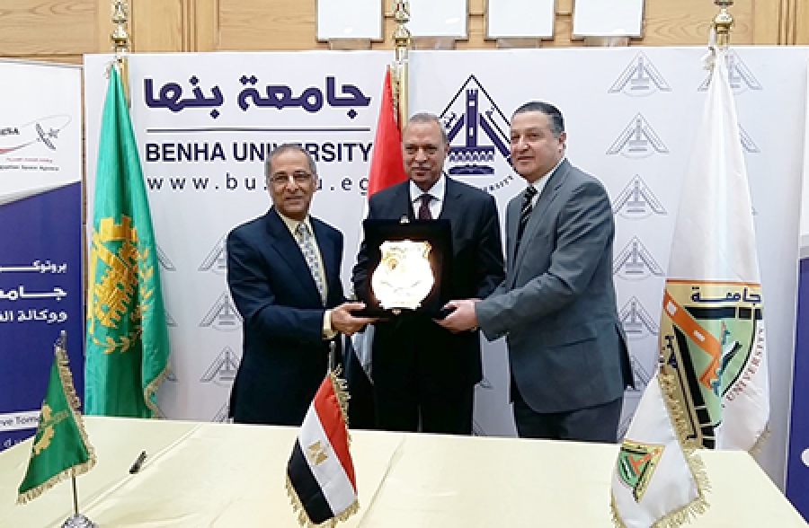 وقع الدكتور/ جمال السعيد - رئيس جامعة بنها، والدكتور/ محمد القوصى - الرئيس التنفيذي لوكالة الفضاء المصرية بروتوكول تعاون بين الجامعة والوكالة.