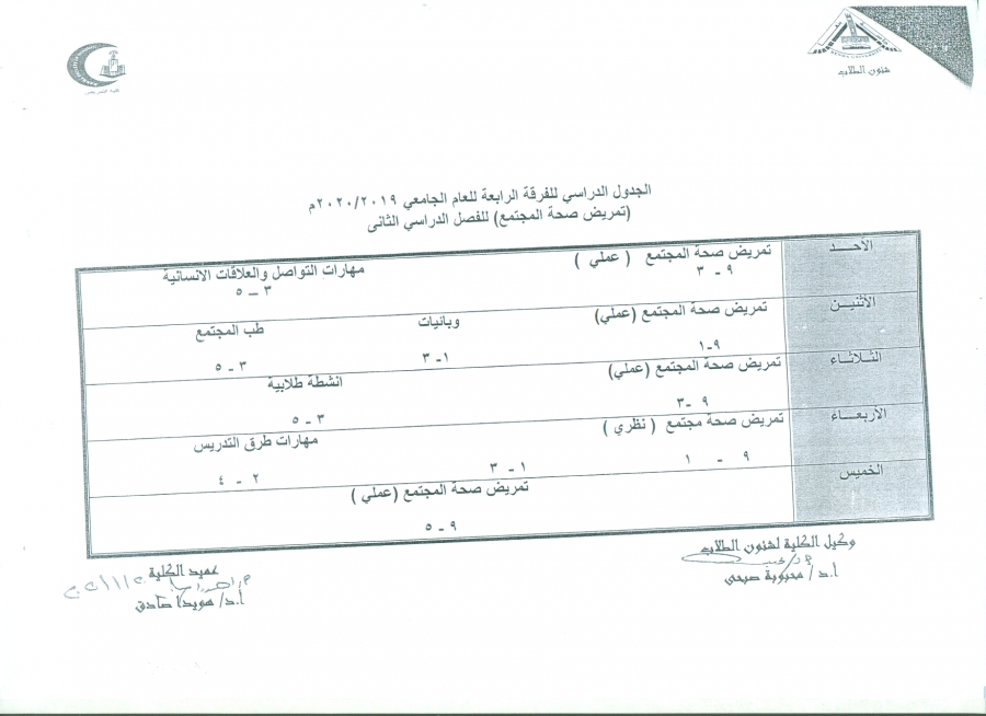 الجدول الدراسى للفرقه الرابعه للعام الجامعى 2019/2020 م ( تمريض صحة المجتمع ) للفصل الدراسى الثانى