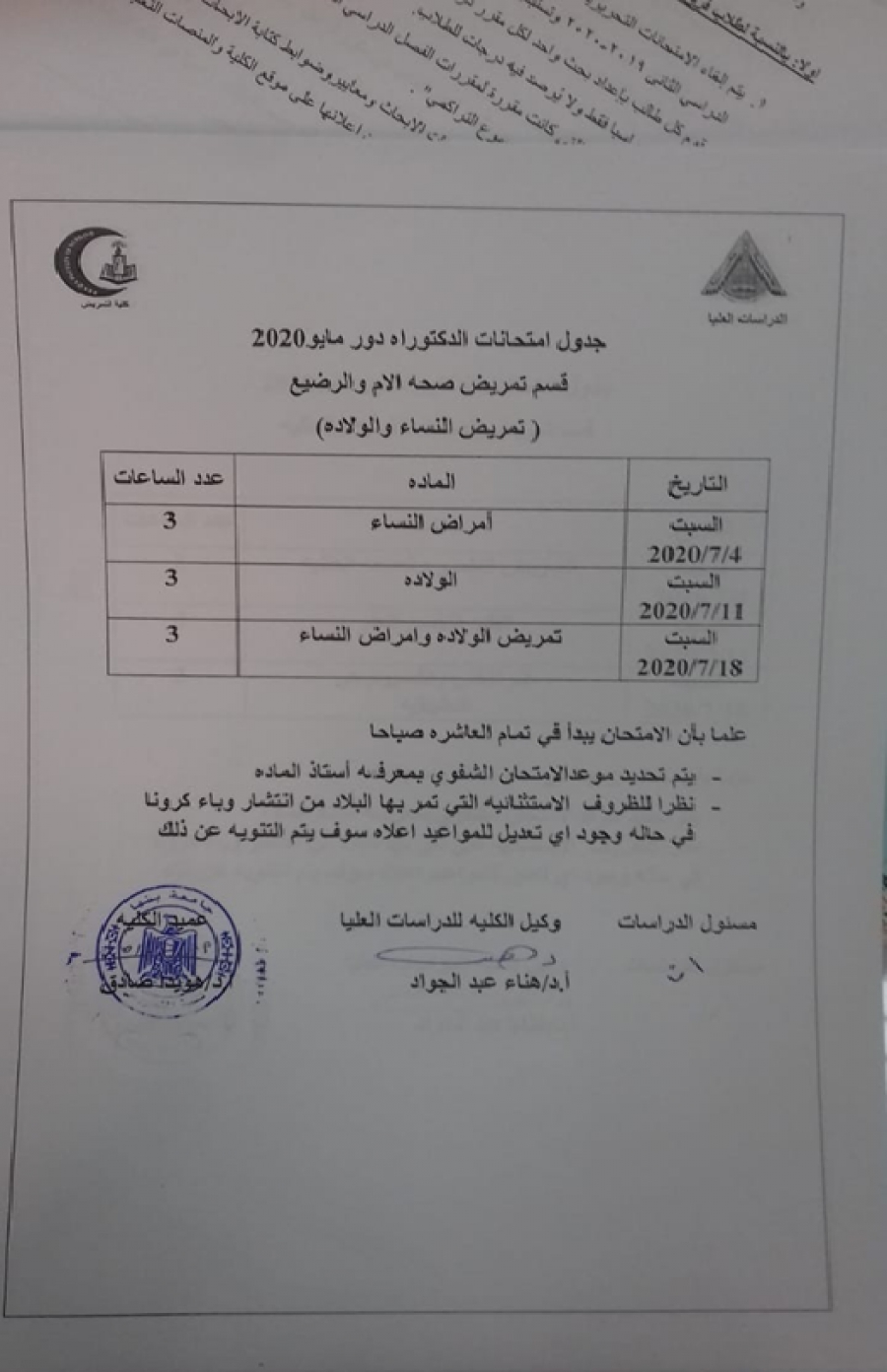 جدول امتحان دكتوراة قسم تمريض صحة الام والرضيع دور مايو 2020