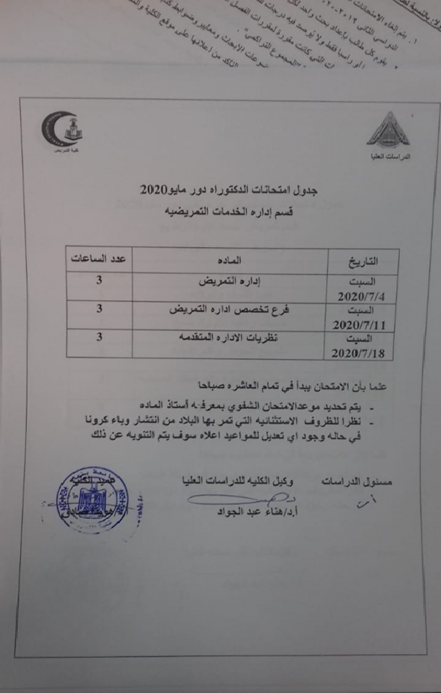 جدول امتحان دكتوراة قسم ادارة الخدمات التمريضية دور مايو 2020
