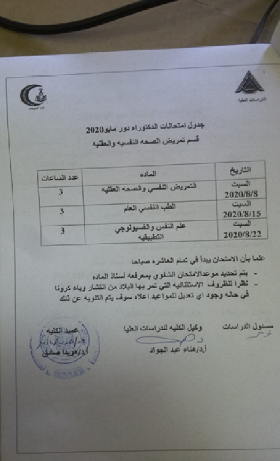 جدول امتحانات دكتوراه قسم تمريض الصحة النفسية والعقلية دور مايو 2020
