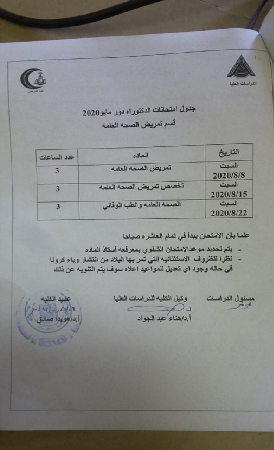 جدول امتحانات دكتوراه قسم تمريض الصحة العامة دور مايو 2020
