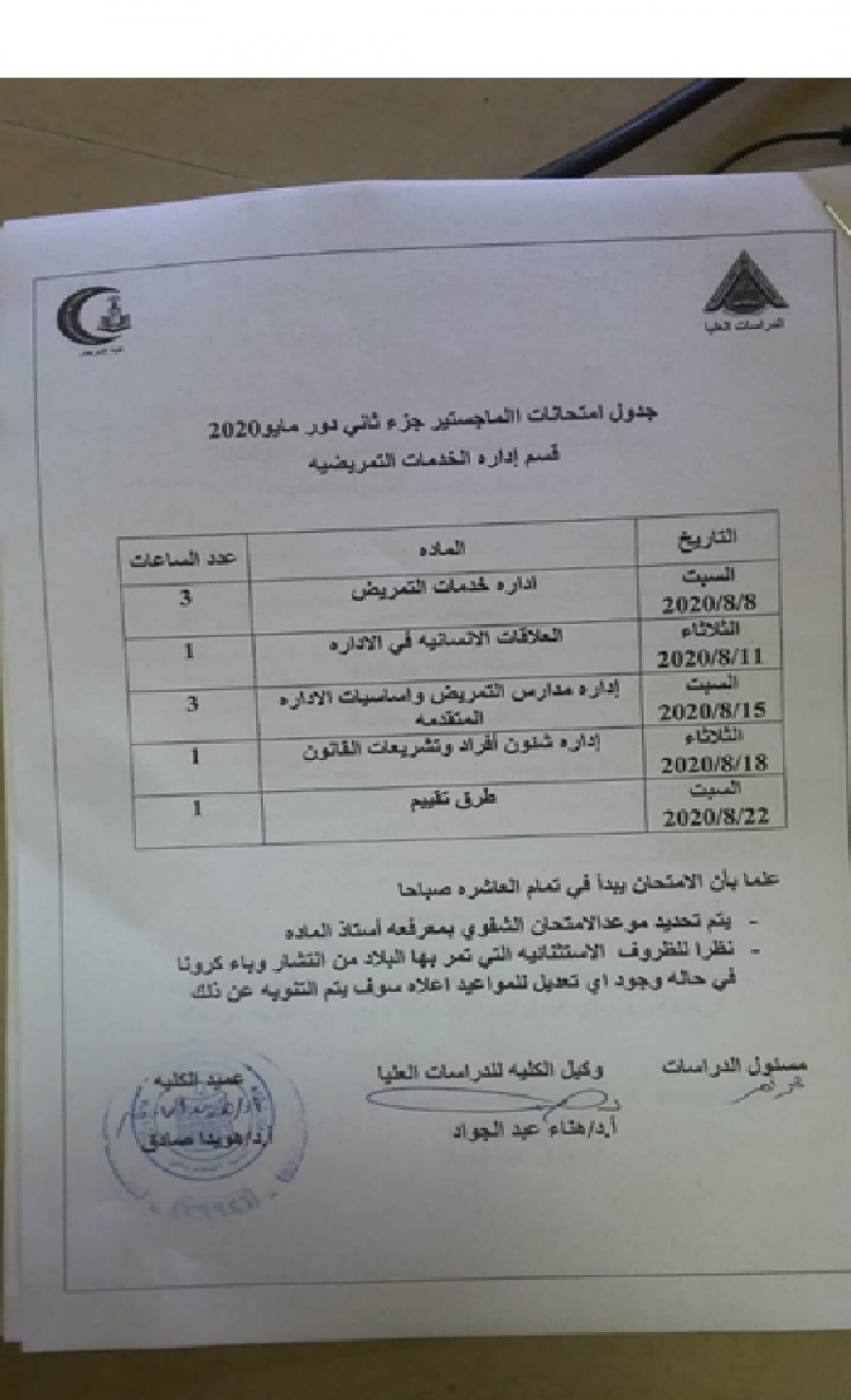 جدول امتحان ماجستير جزء ثانى قسم ادارة الخدمات التمريضية دور مايو 2020