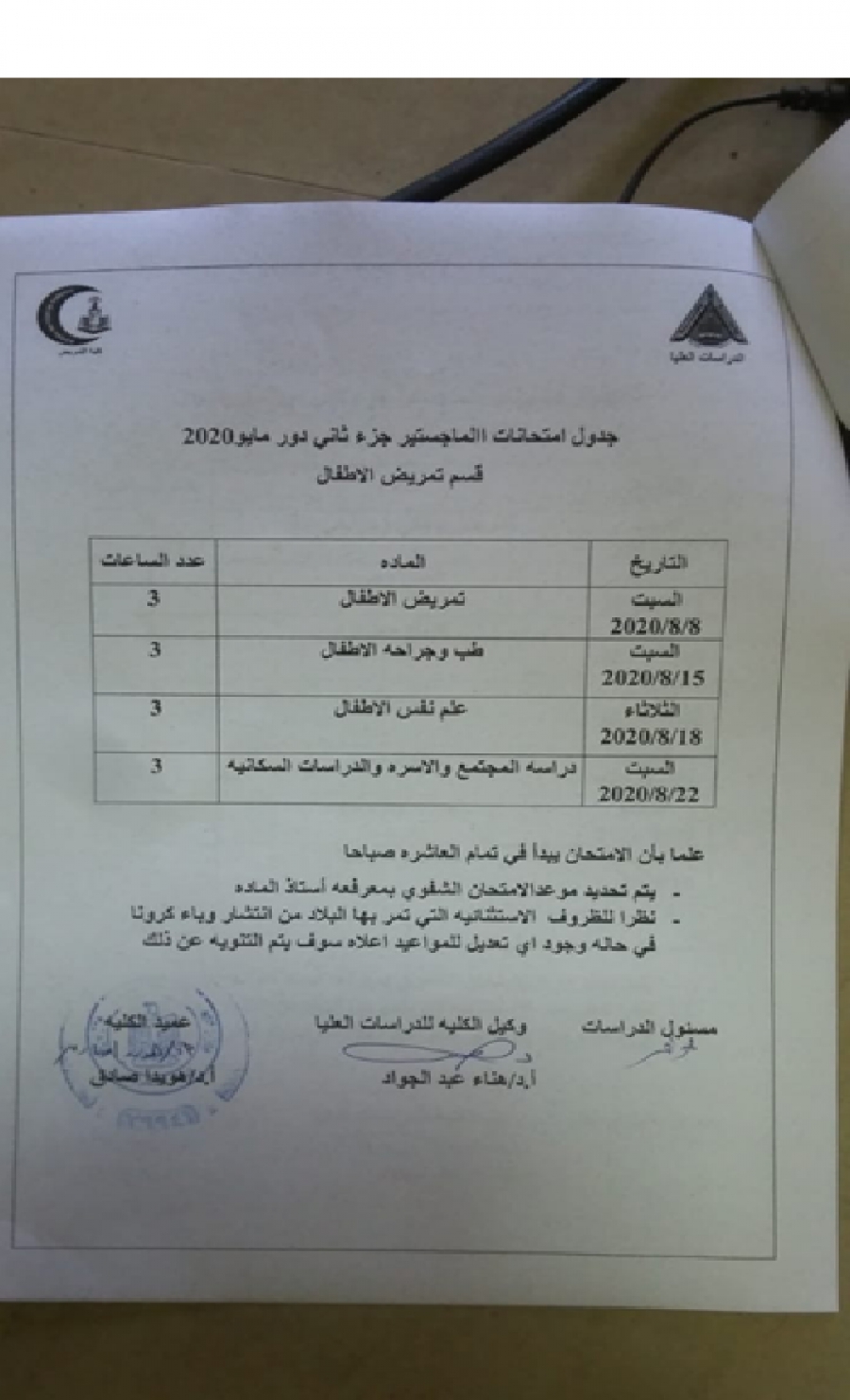جدول امتحان ماجستير جزء ثانى قسم تمريض الاطفال دور مايو 2020