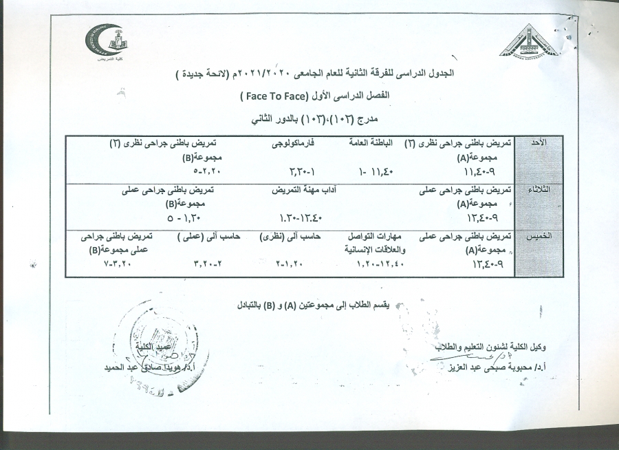 ( face to face ) الجدول الدراسى للفرقه الثانيه للعام الجامعى 2020/2021 م الفصل الدراسى الاول لا ئحه جديده