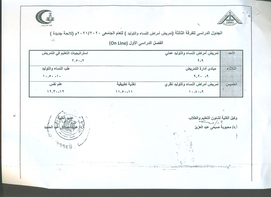 الجدول الدراسى للفرقه الثالثه ( تمريض أمراض النساء والتوليد ) للعام الجامعى 2020/2021 م ( لائحه جديدة ) الفصل الدراسى الاول ( on line )