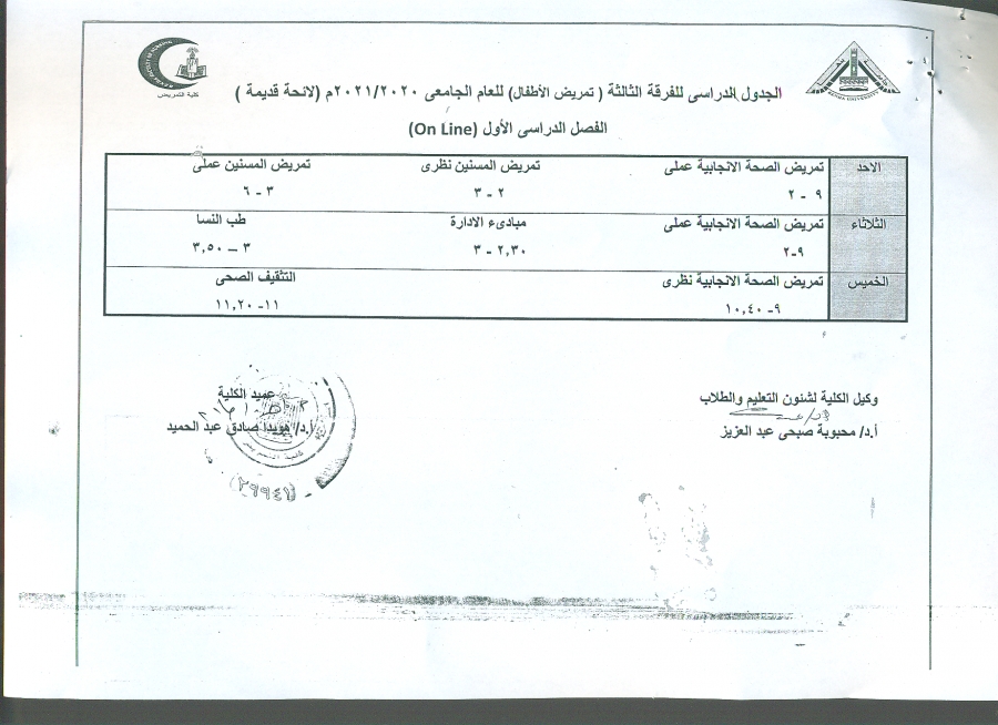 الجدول الدراسى للفرقه الثالثه ( تمريض الأطفال ) للعام الجامعى 2020/2021 م ( لائحه قديمة ) الفصل الدراسى الاول ( on line )