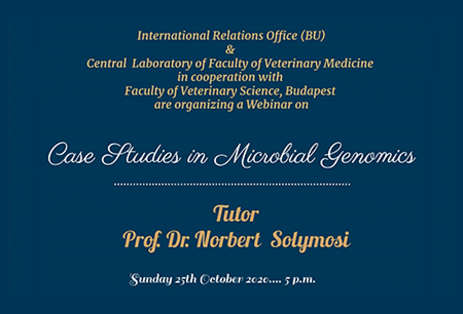 ينظم مكتب العلاقات الدولية والمعامل المركزية بكلية الطب البيطري بالتعاون مع كلية العلوم البيطرية ب بودابيست، ورشة عمل افتراضية بعنوان «دراسات في الجينوم الميكروبي»، وذلك يوم الاحد الموافق ٢٥ أكتوبر ٢٠٢٠ في تمام الخامسة مساءا ولمدة ساعتين، يقدم الورشة الاستاذ الدكتور/ نوربرت سوليموزي
