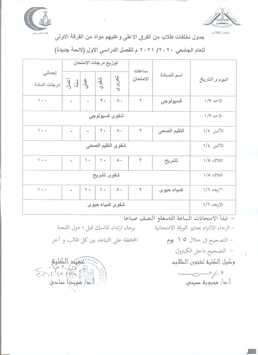 (جدول تخلفات طلاب من الفرق الاعلى وعليهم مواد من الفرقة الاولى للعام الجامعى 2020/2021 للفصل الدراسى الاول (لائحة جديدة