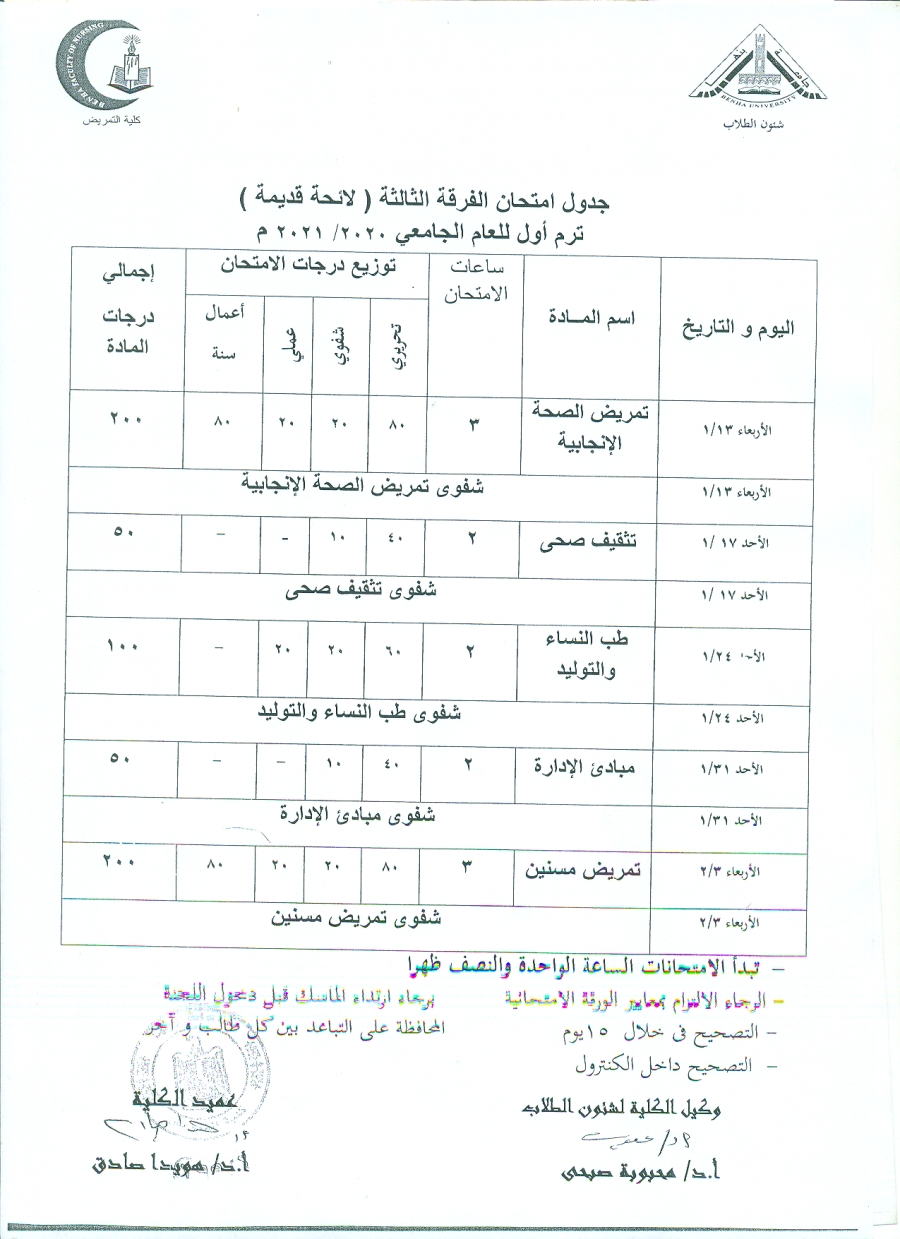 جدول امتحان الفرقة الثالثة لائحة قديمة فصل دراسى أول للعام الجامعى 2020-2021
