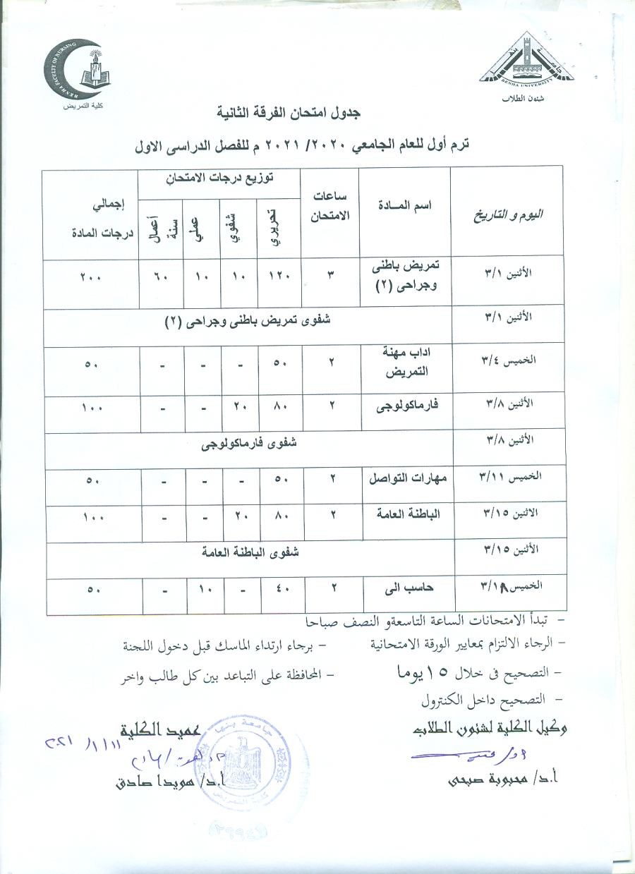 جدول امتحان الفرقة الثانية فصل دراسى أول العام الجامعى 2020-2021