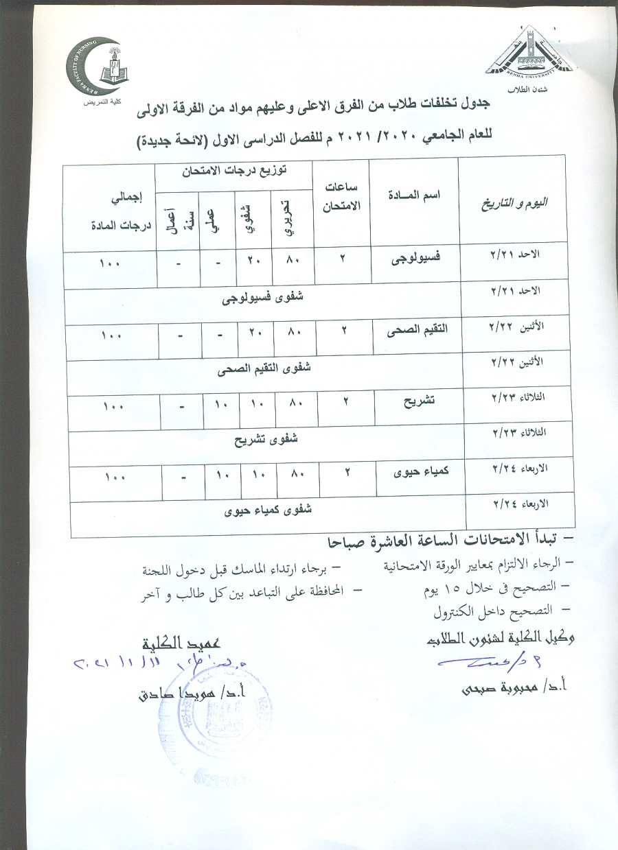 جدول امتحان تخلفات طلاب من الفرق الاعلى وعليهم مواد من الفرقة الاولى للعام الجامعى 2020/2021 للفصل الدراسى الاول لائحة جديده