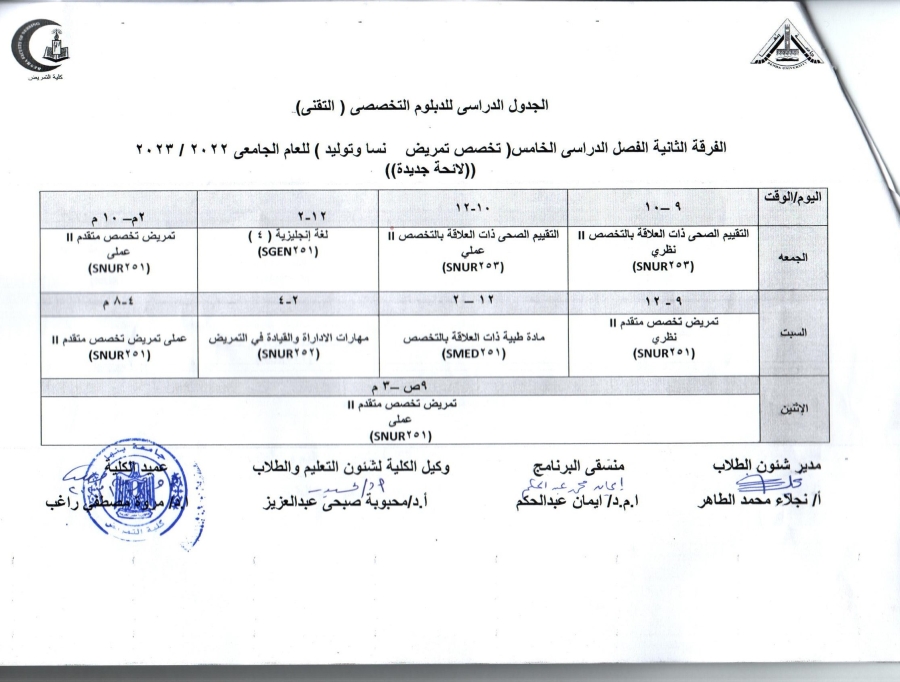 الجدول الدراسى للدبلوم التخصصى التقنى الفرقه الثانيه الفصل الدراسى الخامس( تخصص تمريض نسا وتوليد) لائحه جديده للعام الجامعى 2022/2023