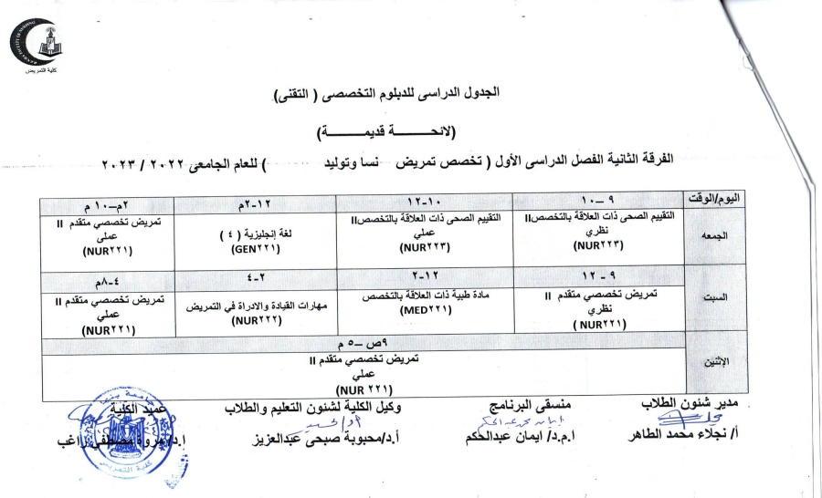 الجدول الدراسى للدبلوم التخصصى التقنى الفرقه الثانيه الفصل الدراسى الاول( تخصص تمريض نسا وتوليد) لائحه قديمه للعام الجامعى 2022/2023