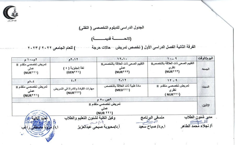 الجدول الدراسى للدبلوم التخصصى التقنى الفرقه الثانيه الفصل الدراسى الاول( تخصص تمريض حالات حرجه) لائحه قديمه للعام الجامعى 2022/2023
