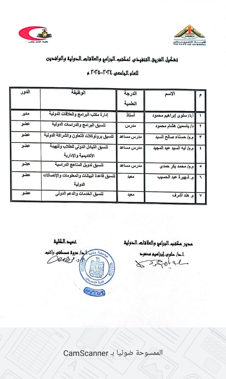 تشكيل الفريق التنفيذى لمكتب البرامج والعلاقات الدولية والوافدين للعام الجامعى 2024-2025